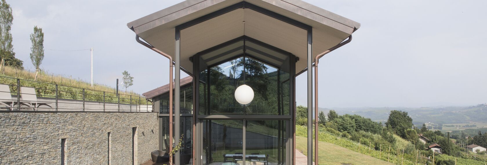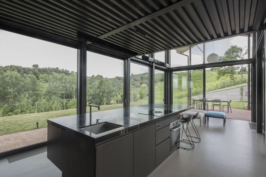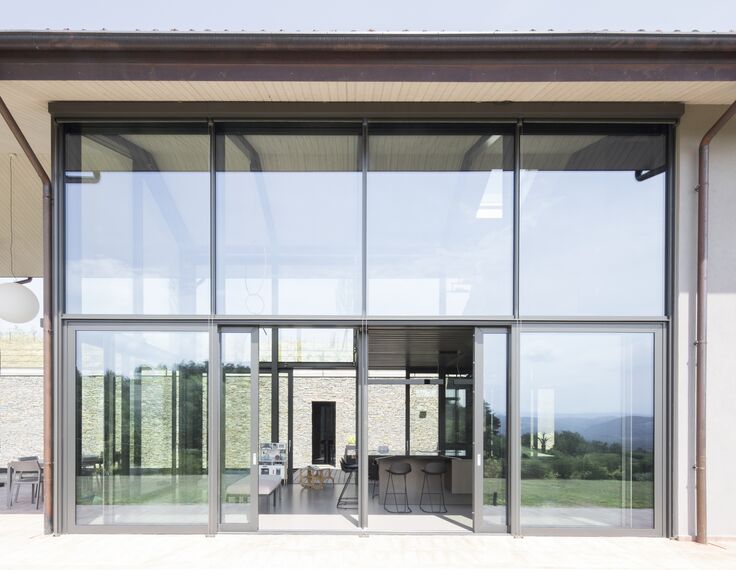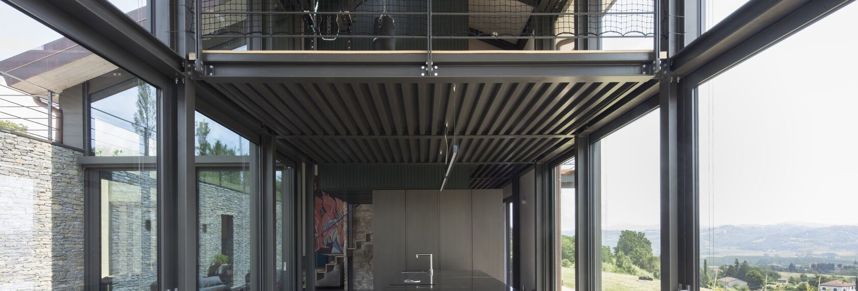 The new glass volume offers the sensation of carrying out daily activities immersed in the hilly landscape.