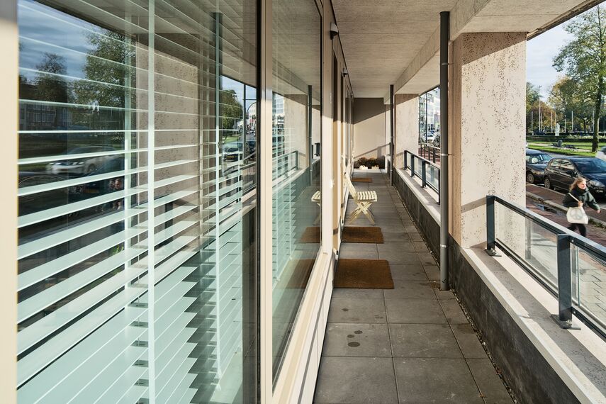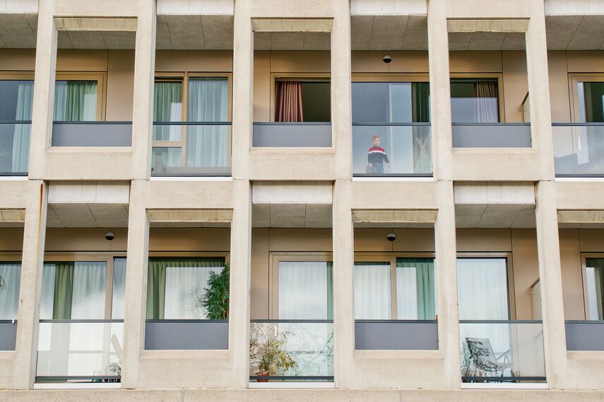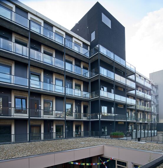 On the ground floor, there are five patio homes, which are closed at the front and open at the back. The patios are sunk into the old office roof and placed in such a way that there is maximum light, while the view from the apartments above is minimized. The noise nuisance from the railway at the rear is also limited by the sheltered location of the patios. The patios are covered with panels in the same light color as the aluminum windows, which gives a calm appearance. “You can see that residents have hung up lights and placed planters. They feel invited to make the building their own. ” Jansbuitensingel offers a diverse range of housing that suits the inner-city living environment of Arnhem, which is no longer the reconstruction city of yesteryear but a popular place to live. This requires dynamic and diverse housing typologies. By leaving the functional parts of the building intact, such as the floors, columns, and outer wall, the houses can be offered for attractive rents. At the same time, the spacious patio houses also provide for the higher segment. By enlarging an existing quality - a characteristic grid facade - the building acquires the recognisability that suits a residential complex. “You can see the building from afar in the street. That gives the residents a sense of individuality, which hopefully makes them think: that is my home. ” An outdated office building has been upgraded into a contemporary residential complex that fits seamlessly into the inner city fabric. Moreover, it meets modern energy requirements through the smart placement of solar panels on the roof. It is not disguised that this is an existing building that is getting a new lease of life. By making smart use of the existing potential, worn-out architecture has been elevated to an efficient yet attractive residential building. Light and noise standards have been met by making optimal use of the open facade structure. Indeed, a successful case study for inner-city transformation.